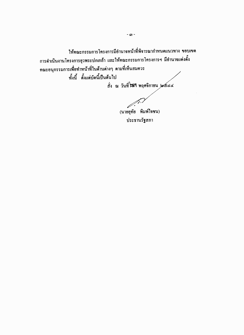 ชื่อเอกสาร :   คำสั่งรัฐสภา ที่ 33 / 2544 เรื่อง แต่งตั้งคณะกรรมการโครงการยุวพระปกเกล้า