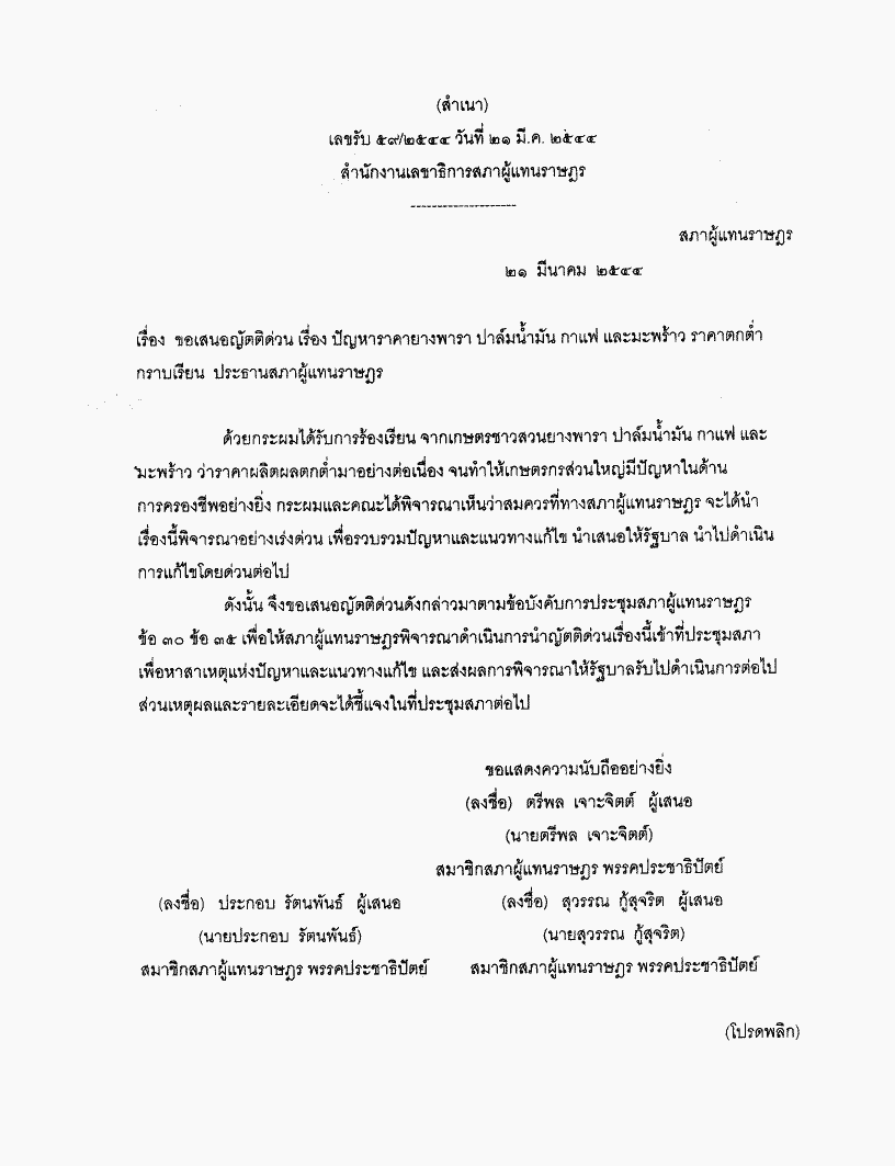 • ขอเสนอญัตติด่วน เรื่อง ปัญหาราคายางพารา ปาล์มน้ำมัน กาแฟ และมะพร้าว ราคาตกต่ำ