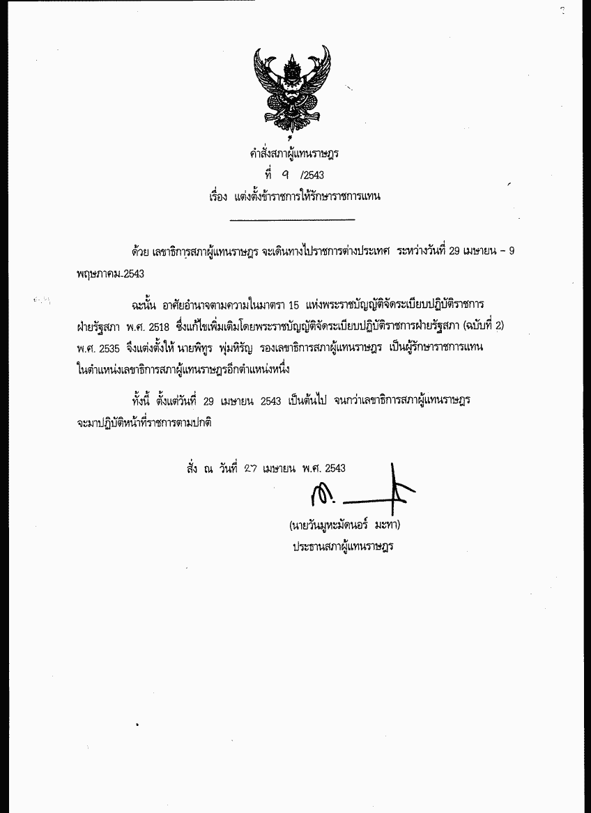 คำสั่งสภาผู้แทนราษฎร ที่ 9/2543 เรื่อง แต่งตั้งข้าราชการให้รักษาราชการแทน |