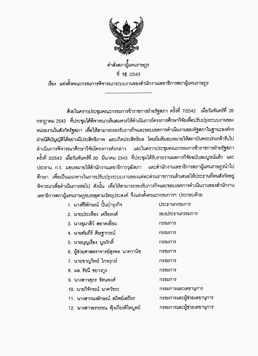 คำสั่งสภาผู้แทนราษฎร ที่ 12/2543 เรื่อง แต่งตั้งคณะกรรมการพิจารณาระบบงานของสำนักงานเลขาธิการสภาผู้แทนราษฎร |