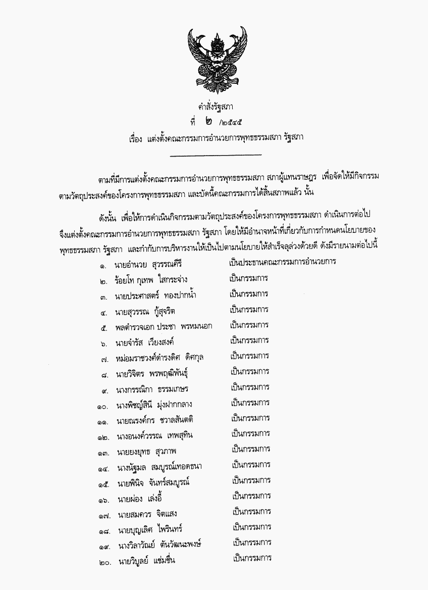 คำสั่งรัฐสภา ที่ 2 / 2545 เรื่อง แต่งตั้งคณะกรรมการอำนวยการพุทธธรรมสภา รัฐสภา |