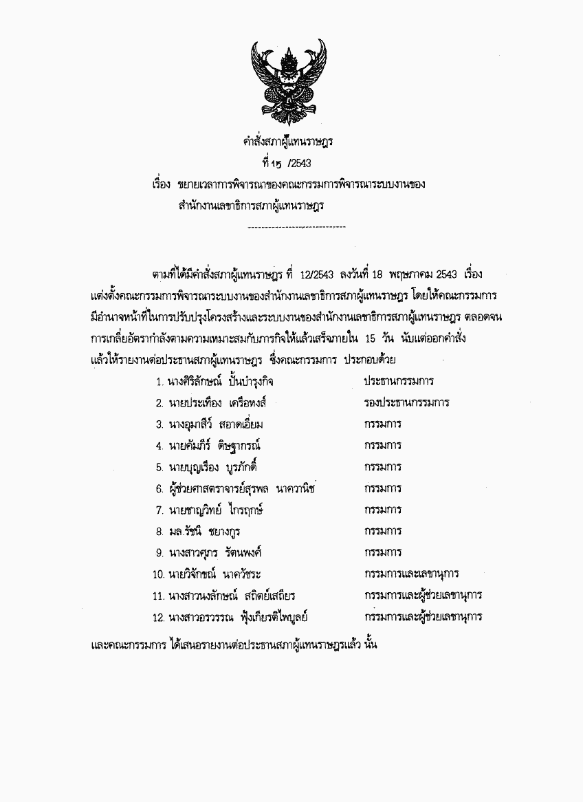 คำสั่งสภาผู้แทนราษฎร ที่ 15/2543 เรื่อง ขยายเวลาการพิจารณาของคณะกรรมการพิจารณาระบบงานของสำนักงานเลขาธิการสภาผู้แทนราษฎร |