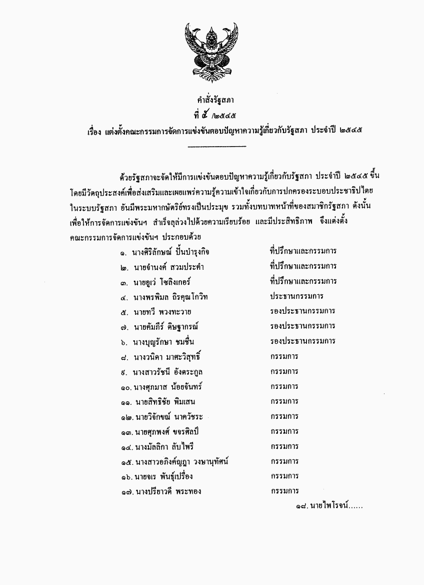 คำสั่งรัฐสภา ที่ 5 / 2545 เรื่อง แต่งตั้งคณะกรรมการจัดการแข่งขันตอบปัญหาความรู้เกี่ยวกับรัฐสภา ประจำปี 2545 |