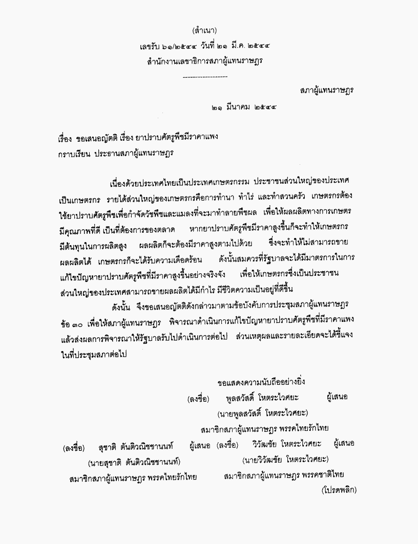 • ขอเสนอญัตติ เรื่อง ยาปราบศัตรูพืชมีราคาแพง