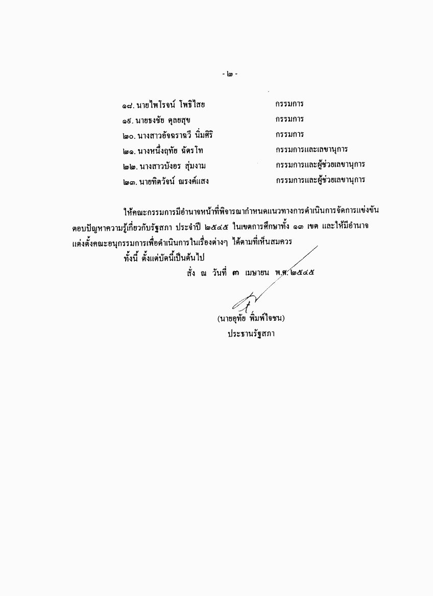 แต่งตั้งคณะกรรมการจัดการแข่งขันตอบปัญหาความรู้เกี่ยวกับรัฐสภา ประจำปี 2545 |
