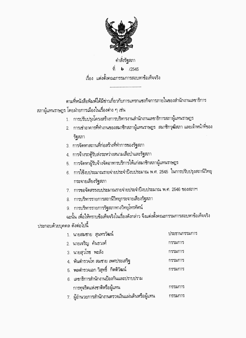 คำสั่งรัฐสภา ที่ 6 / 2545 เรื่อง แต่งตั้งคณะกรรมการสอบหาข้อเท็จจริง |