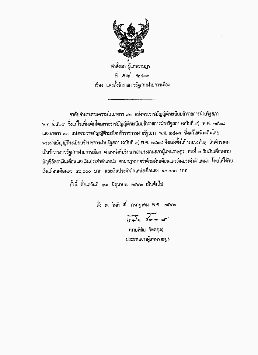 คำสั่งสภาผู้แทนราษฎร ที่ 17/2543 เรื่อง แต่งตั้งข้าราชการรัฐสภาฝ่ายการเมือง |
