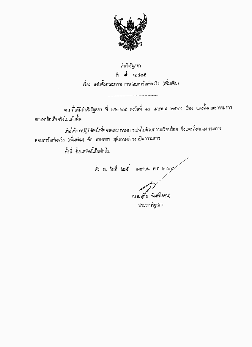 คำสั่งรัฐสภา ที่ 8 / 2545 เรื่อง แต่งตั้งคณะกรรมการสอบหาข้อเท็จจริง (เพิ่มเติม) |