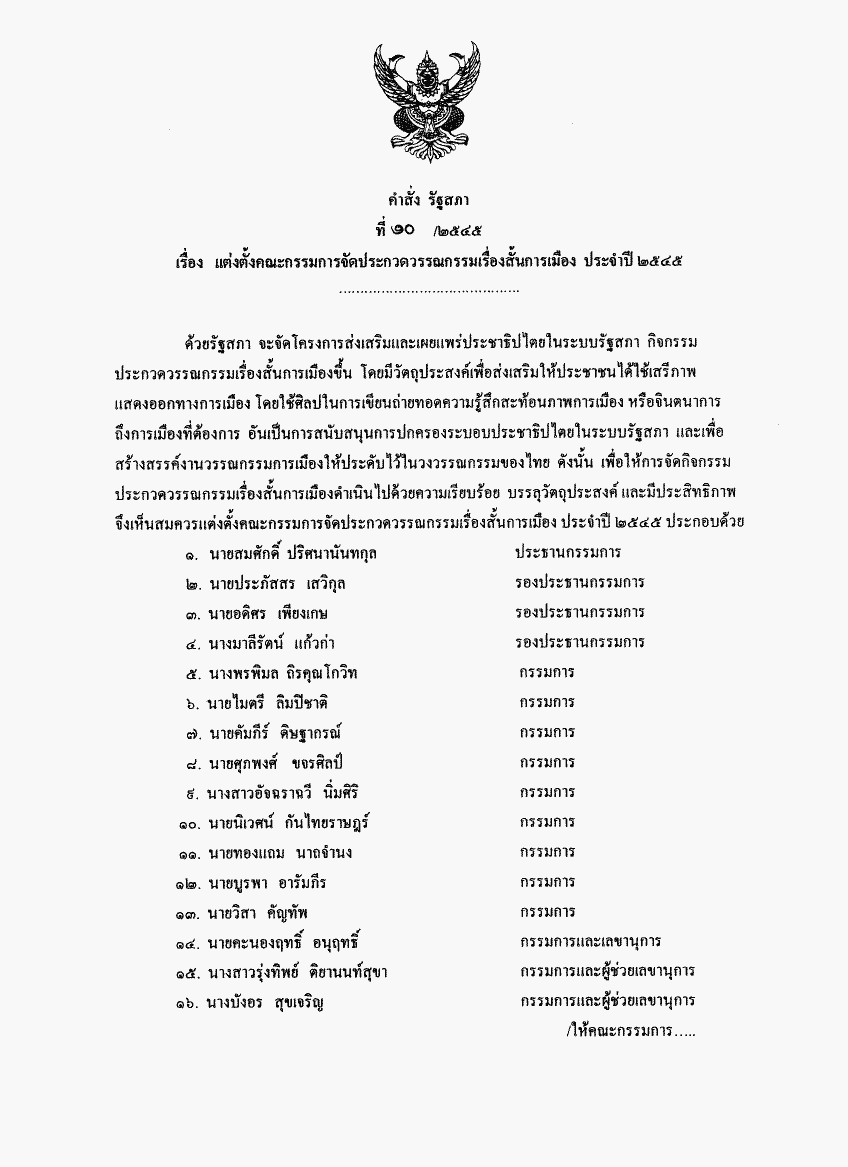 คำสั่งรัฐสภา ที่ 10 / 2545 เรื่อง แต่งตั้งคณะกรรมการจัดประกวดวรรณกรรมเรื่องสั้นการเมือง ประจำปี 2545 |