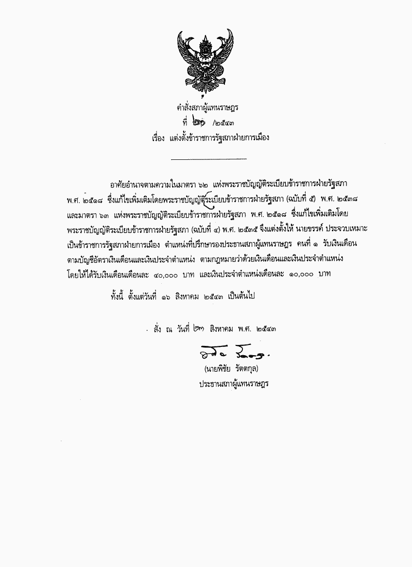 คำสั่งสภาผู้แทนราษฎร ที่ 21/2543 เรื่อง แต่งตั้งข้าราชการรัฐสภาฝ่ายการเมือง |