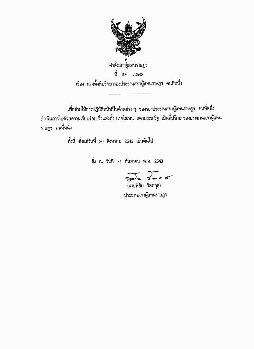 คำสั่งสภาผู้แทนราษฎร ที่ 23/2543 เรื่อง แต่งตั้งที่ปรึกษารองประธานสภาผู้แทนราษฎร คนที่หนึ่ง |