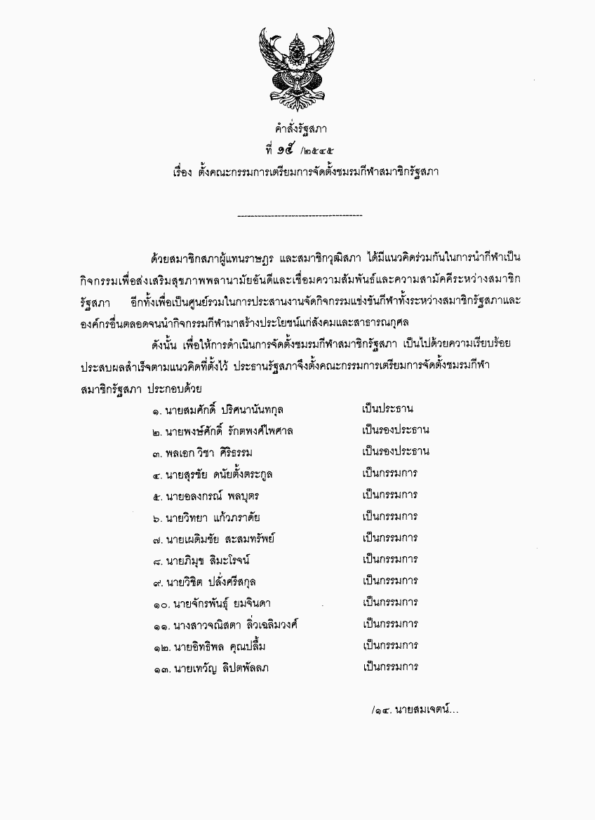 คำสั่งรัฐสภา ที่ 15 / 2545 เรื่อง ตั้งคณะกรรมการเตรียมการจัดตั้งชมรมกีฬาสมาชิกรัฐสภา |