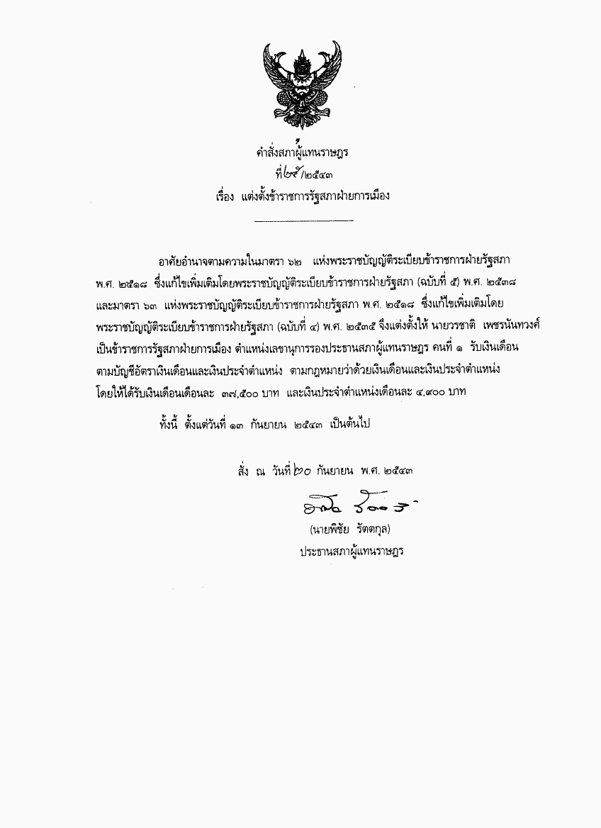 คำสั่งสภาผู้แทนราษฎร ที่ 25/2543 เรื่อง แต่งตั้งข้าราชการรัฐสภาฝ่ายการเมือง |