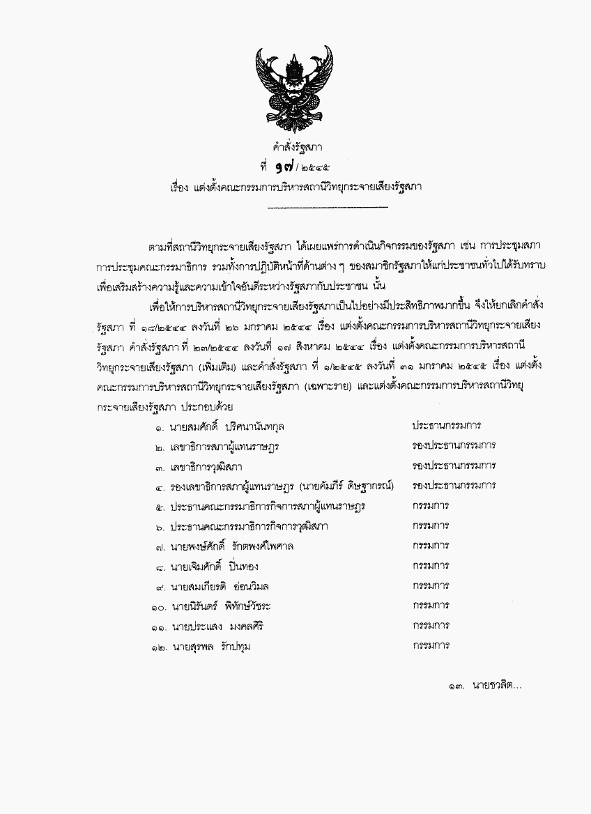 คำสั่งรัฐสภา ที่ 17 / 2545 เรื่อง แต่งตั้งคณะกรรมการบริหารสถานีวิทยุกระจายเสียงรัฐสภา |