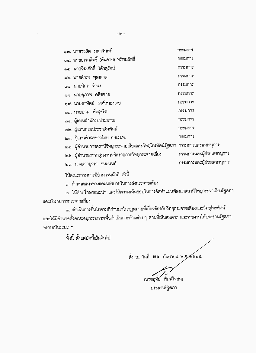 คำสั่งรัฐสภา ที่ 17 / 2545 เรื่อง แต่งตั้งคณะกรรมการบริหารสถานีวิทยุกระจายเสียงรัฐสภา |
