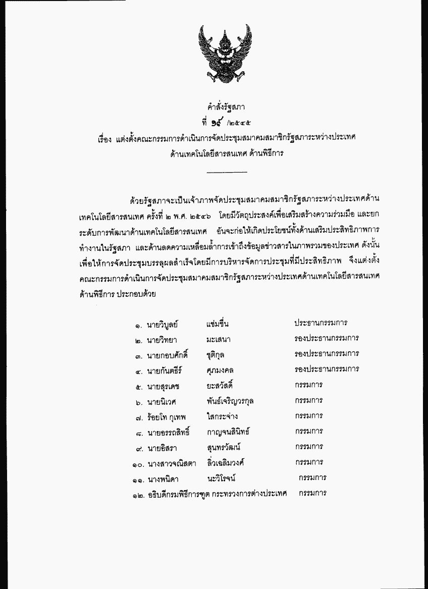 คำสั่งรัฐสภา ที่ 19 / 2545 เรื่อง แต่งตั้งคณะกรรมการดำเนินการจัดประชุมสมาคมสมาชิกรัฐสภาระหว่างประเทศด้านเทคโนโลยีสารสนเทศ ด้านพิธีการ |