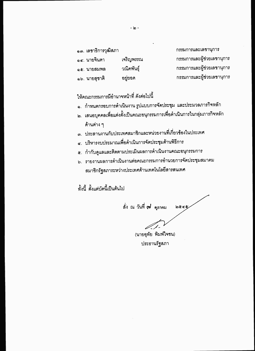 คำสั่งรัฐสภา ที่ 19 / 2545 เรื่อง แต่งตั้งคณะกรรมการดำเนินการจัดประชุมสมาคมสมาชิกรัฐสภาระหว่างประเทศด้านเทคโนโลยีสารสนเทศ ด้านพิธีการ |