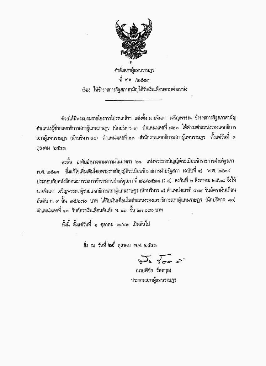 คำสั่งสภาผู้แทนราษฎร ที่ 30/2543 เรื่อง ให้ข้าราชการรัฐสภาสามัญได้รับเงินเดือนตามตำแหน่ง |