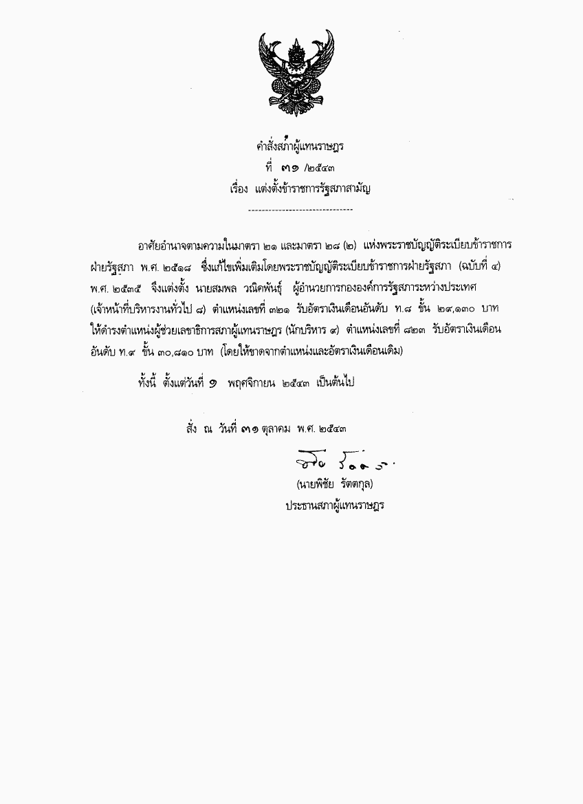คำสั่งสภาผู้แทนราษฎร ที่ 31/2543 เรื่อง แต่งตั้งข้าราชการรัฐสภาสามัญ |