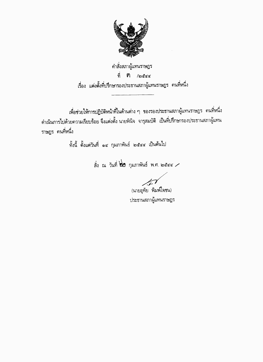 คำสั่งสภาผู้แทนราษฎร ที่ 3/2544 เรื่อง แต่งตั้งที่ปรึกษารองประธานสภาผู้แทนราษฎร คนที่หนึ่ง |
