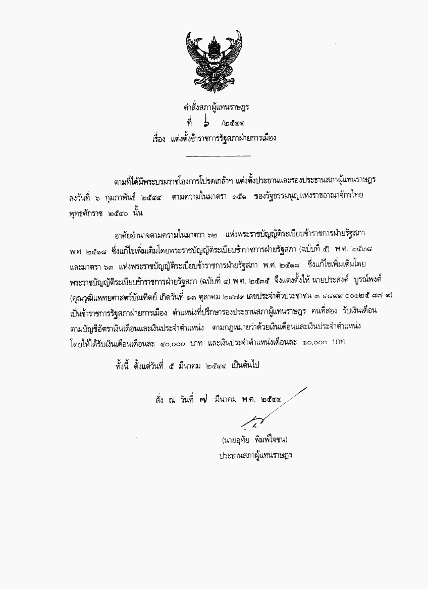 คำสั่งสภาผู้แทนราษฎร ที่ 6/2544 เรื่อง แต่งตั้งข้าราชการรัฐสภาฝ่ายการเมือง |