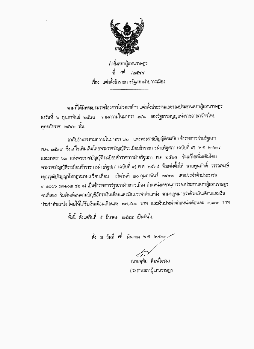 คำสั่งสภาผู้แทนราษฎร ที่ 7/2544 เรื่อง แต่งตั้งข้าราชการรัฐสภาฝ่ายการเมือง |