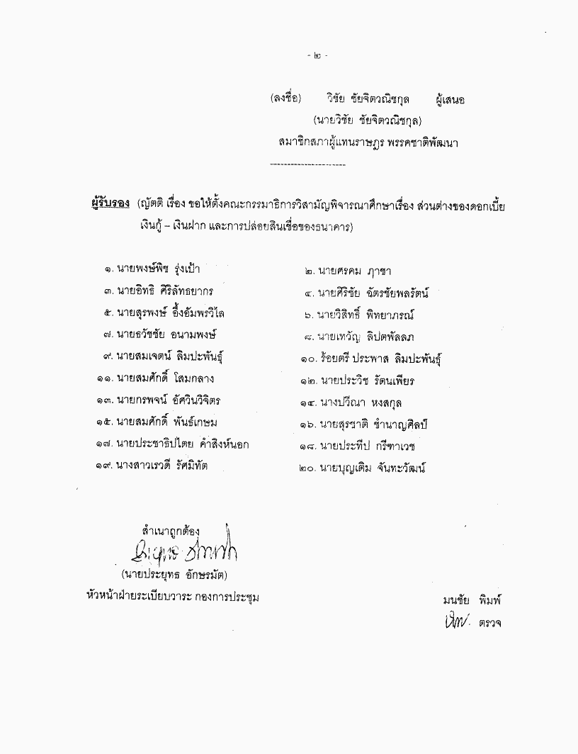 • ขอเสนอญัตติ เรื่อง ขอให้ตั้งคณะกรรมาธิการวิสามัญพิจารณศึกษาเรื่อง ส่วนต่างของดอกเบี้ยเงินกู้ - เงินฝาก และการปล่อยสินเชื่อของธนาคาร