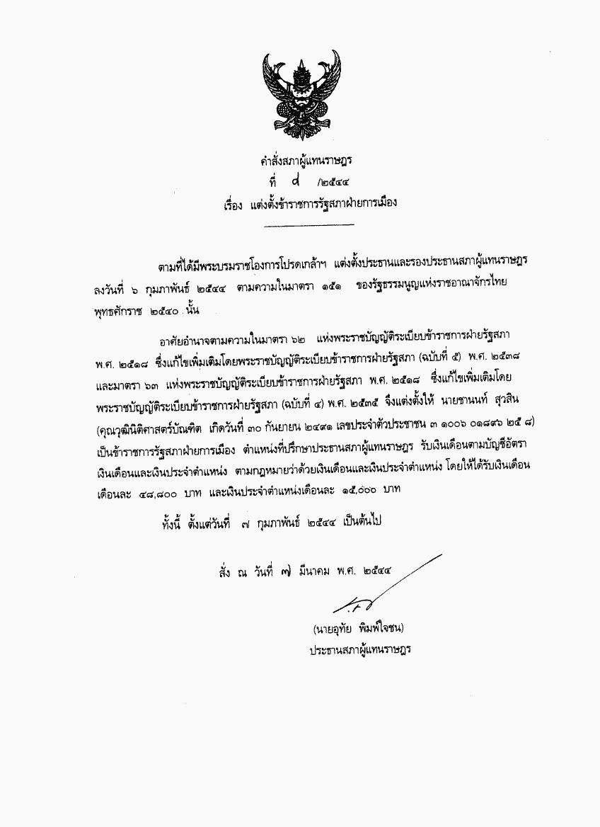 คำสั่งสภาผู้แทนราษฎร ที่ 8/2544 เรื่อง แต่งตั้งข้าราชการรัฐสภาฝ่ายการเมือง |