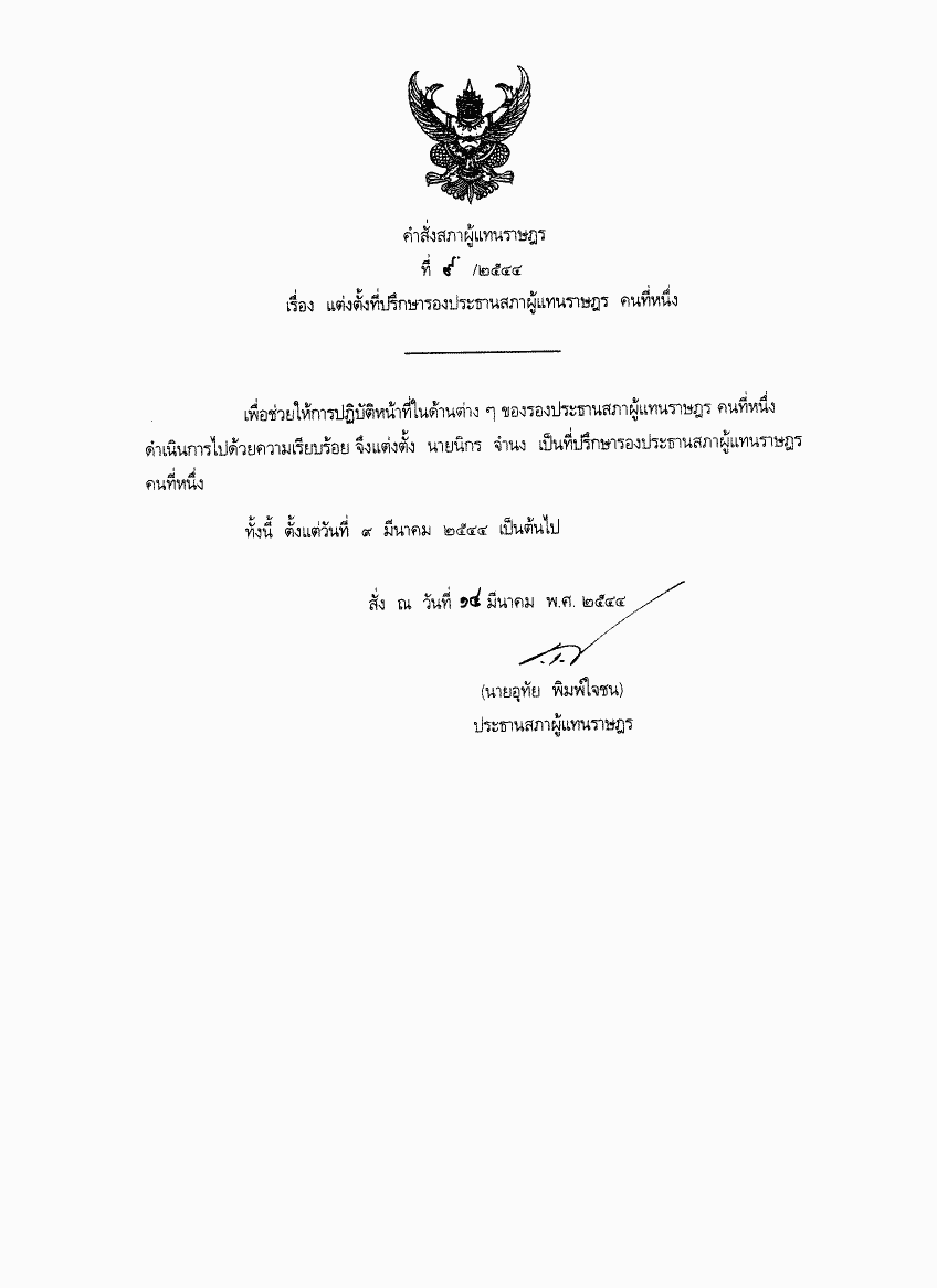 คำสั่งสภาผู้แทนราษฎร ที่ 9/2544 เรื่อง แต่งตั้งที่ปรึกษารองประธานสภาผู้แทนราษฎร คนที่หนึ่ง |
