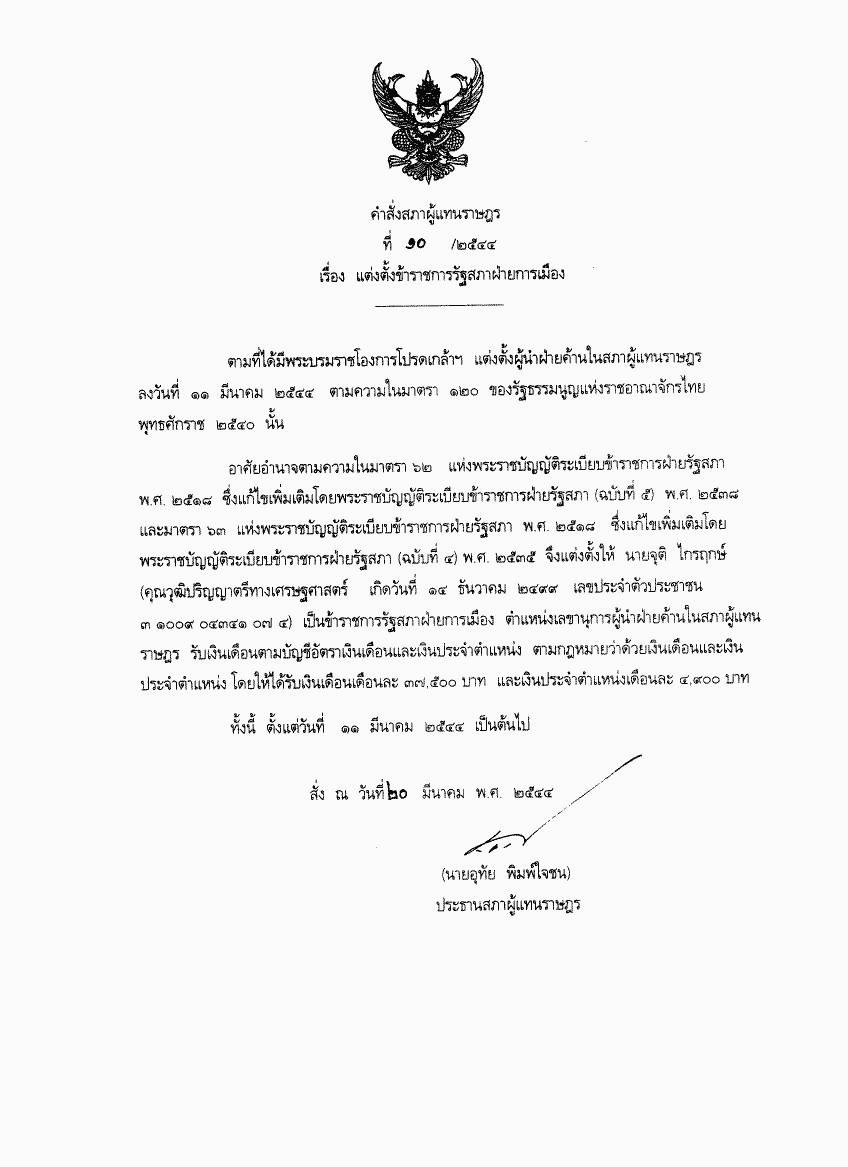 คำสั่งสภาผู้แทนราษฎร ที่ 10/2544 เรื่อง แต่งตั้งข้าราชการรัฐสภาฝ่ายการเมือง |