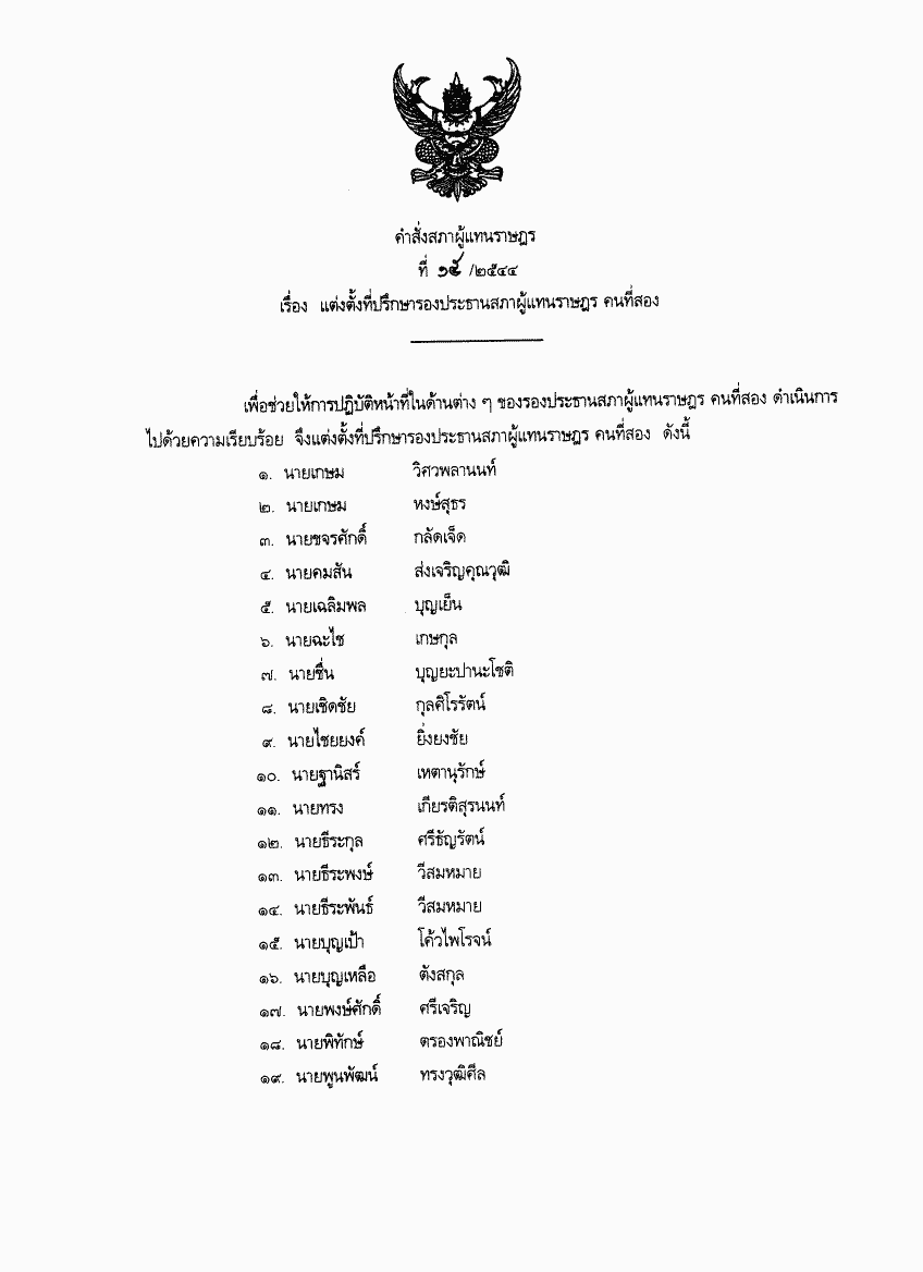 • คำสั่งสภาผู้แทนราษฎร ที่ 15/2544 เรื่อง แต่งตั้งที่ปรึกษารองประธานสภาผู้แทนราษฎร คนที่สอง