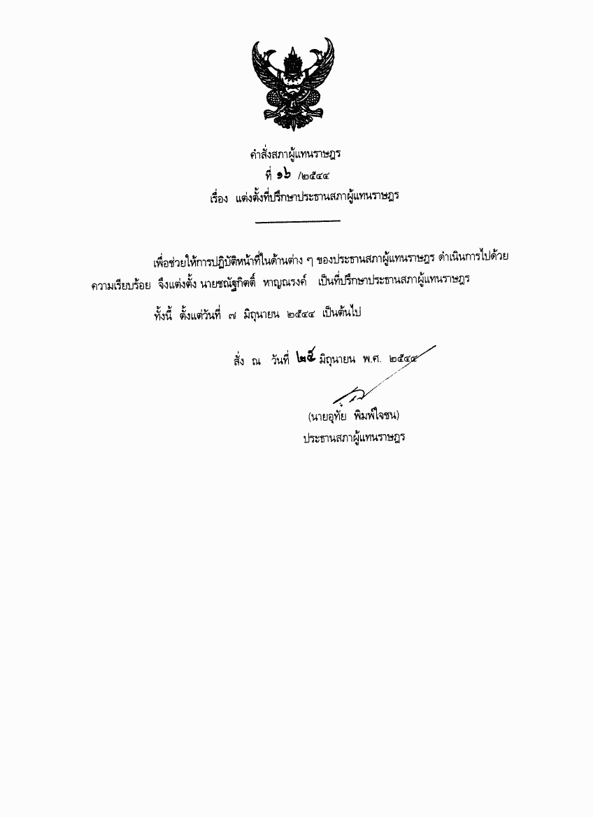 คำสั่งสภาผู้แทนราษฎร ที่ 16/2544 เรื่อง แต่งตั้งที่ปรึกษาประธานสภาผู้แทนราษฎร |