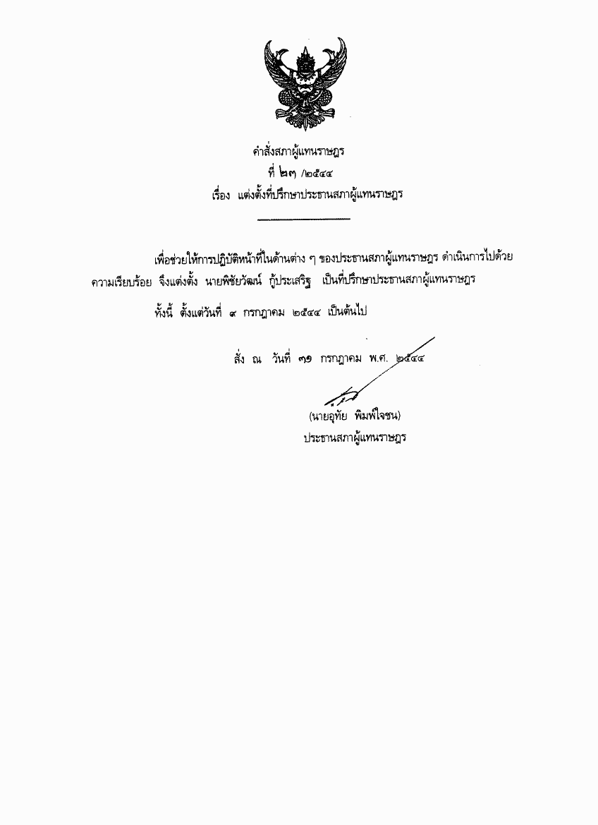คำสั่งสภาผู้แทนราษฎร ที่ 23/2544 เรื่อง แต่งตั้งที่ปรึกษาประธานสภาผู้แทนราษฎร |