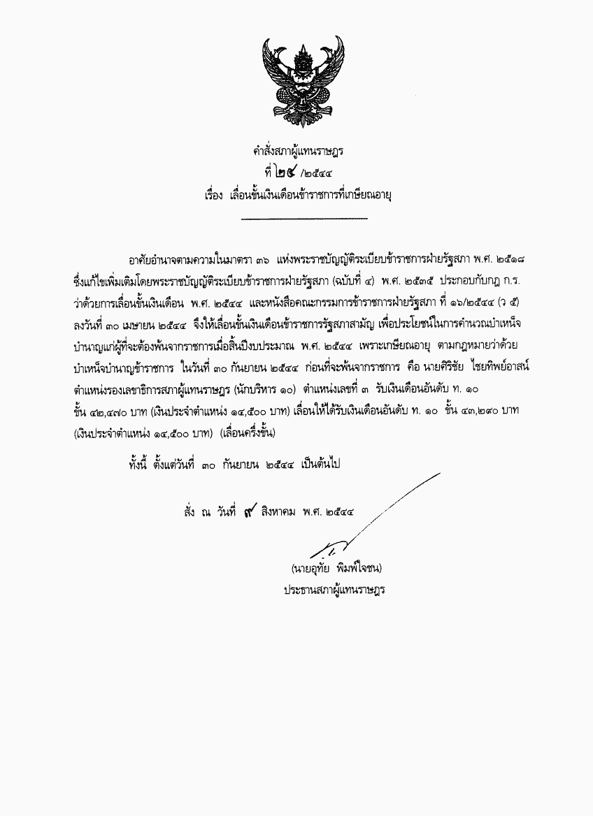 คำสั่งสภาผู้แทนราษฎร ที่ 24/2544 เรื่อง เลื่อนขั้นเงินเดือนข้าราชการที่เกษียณอายุ |