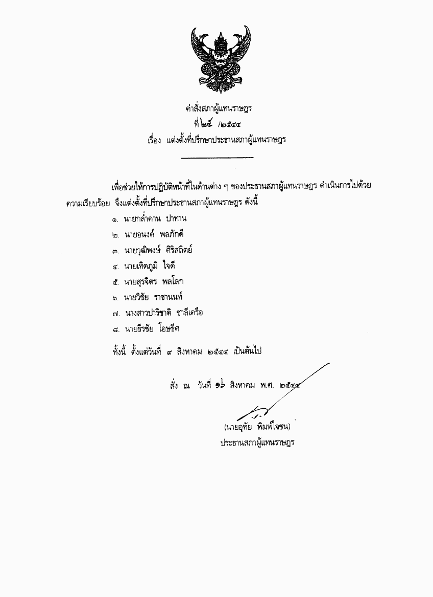 คำสั่งสภาผู้แทนราษฎร ที่ 25/2544 เรื่อง แต่งตั้งที่ปรึกษาประธานสภาผู้แทนราษฎร |