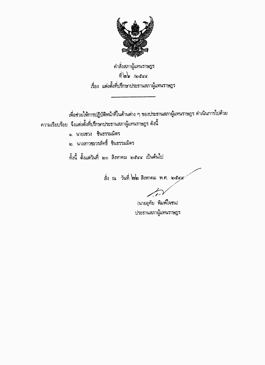 คำสั่งสภาผู้แทนราษฎร ที่ 26/2544 เรื่อง แต่งตั้งที่ปรึกษาประธานสภาผู้แทนราษฎร |