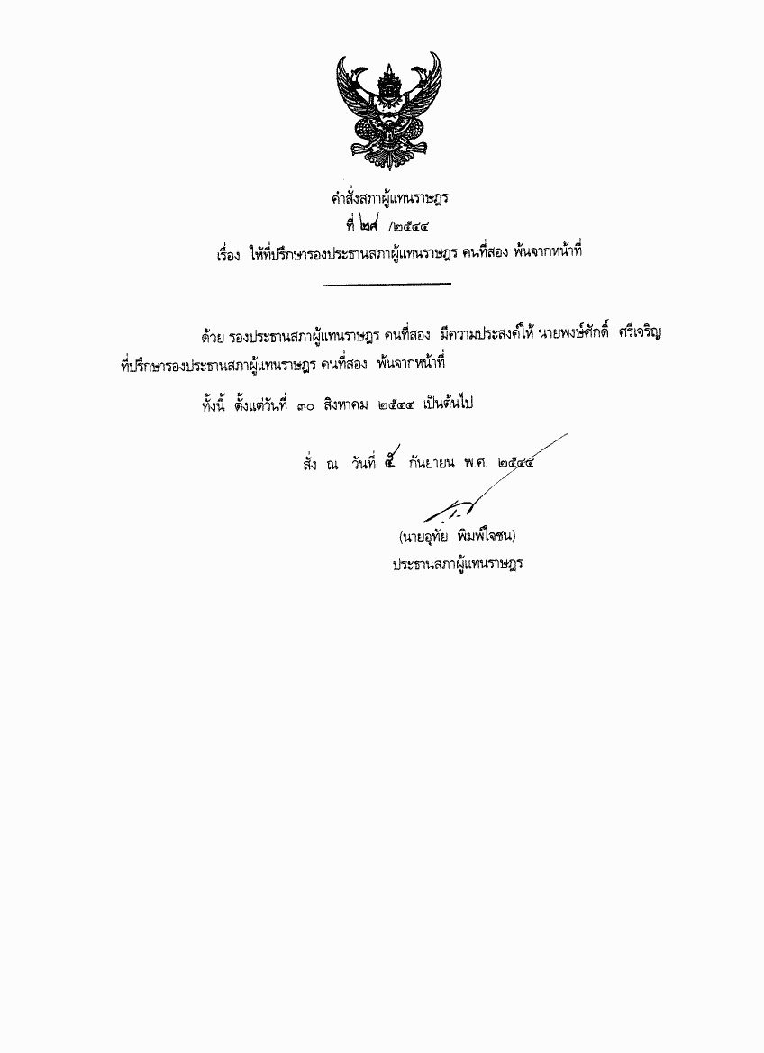 คำสั่งสภาผู้แทนราษฎร ที่ 28/2544 เรื่อง ให้ที่ปรึกษารองประธานสภาผู้แทนราษฎร คนที่สอง พ้นจากหน้าที่ |