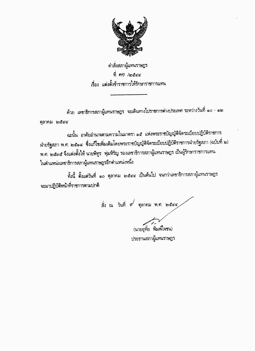 คำสั่งสภาผู้แทนราษฎร ที่ 31/2544 เรื่อง แต่งตั้งข้าราชการให้รักษาราชการแทน |