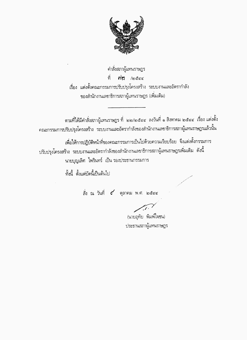 คำสั่งสภาผู้แทนราษฎร ที่ 32/2544 เรื่อง แต่งตั้งคณะกรรมการปรับปรุงโครงสร้าง ระบบงานและอัตรากำลัง |