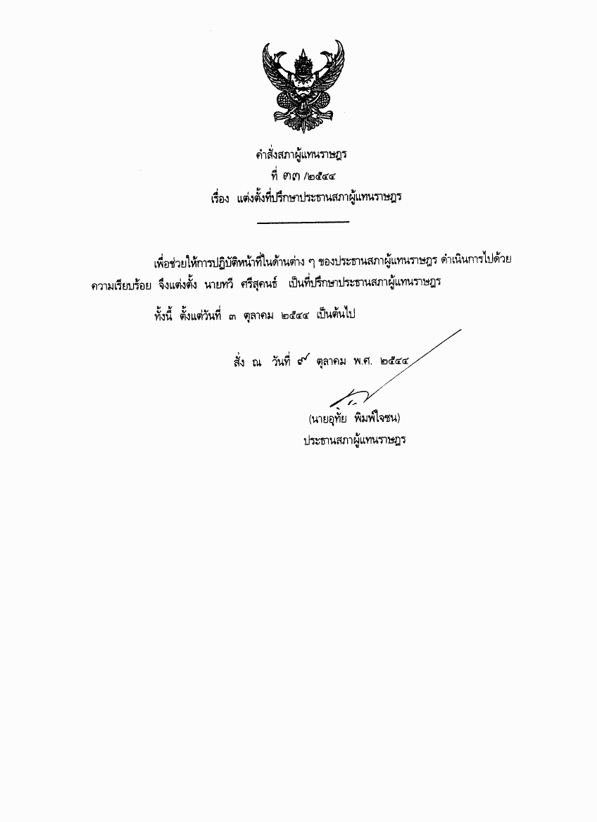 คำสั่งสภาผู้แทนราษฎร ที่ 33/2544 เรื่อง แต่งตั้งที่ปรึกษาประธานสภาผู้แทนราษฎร |