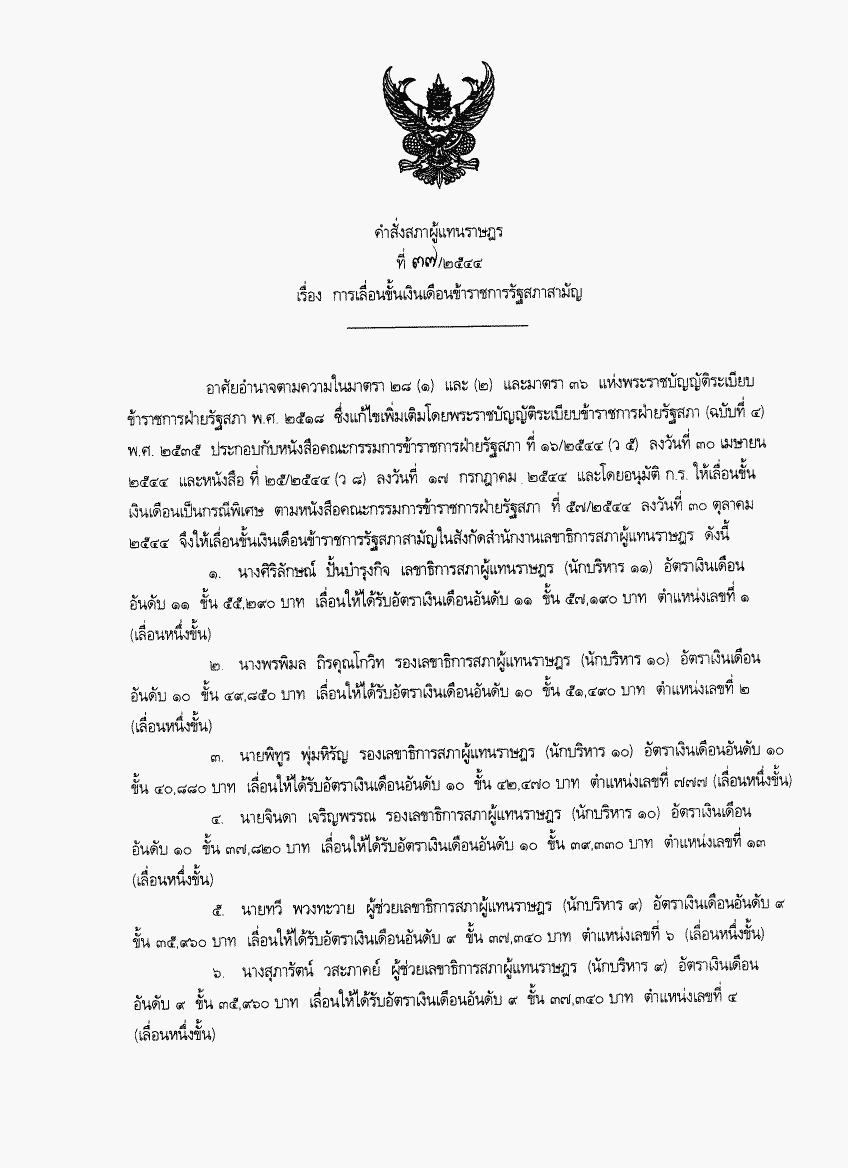 ชื่อเอกสาร : คำสั่งสภาผู้แทนราษฎร ที่ 37/2544 เรื่อง การเลื่อนขั้นเงินเดือนข้าราชการรัฐสภาสามัญ