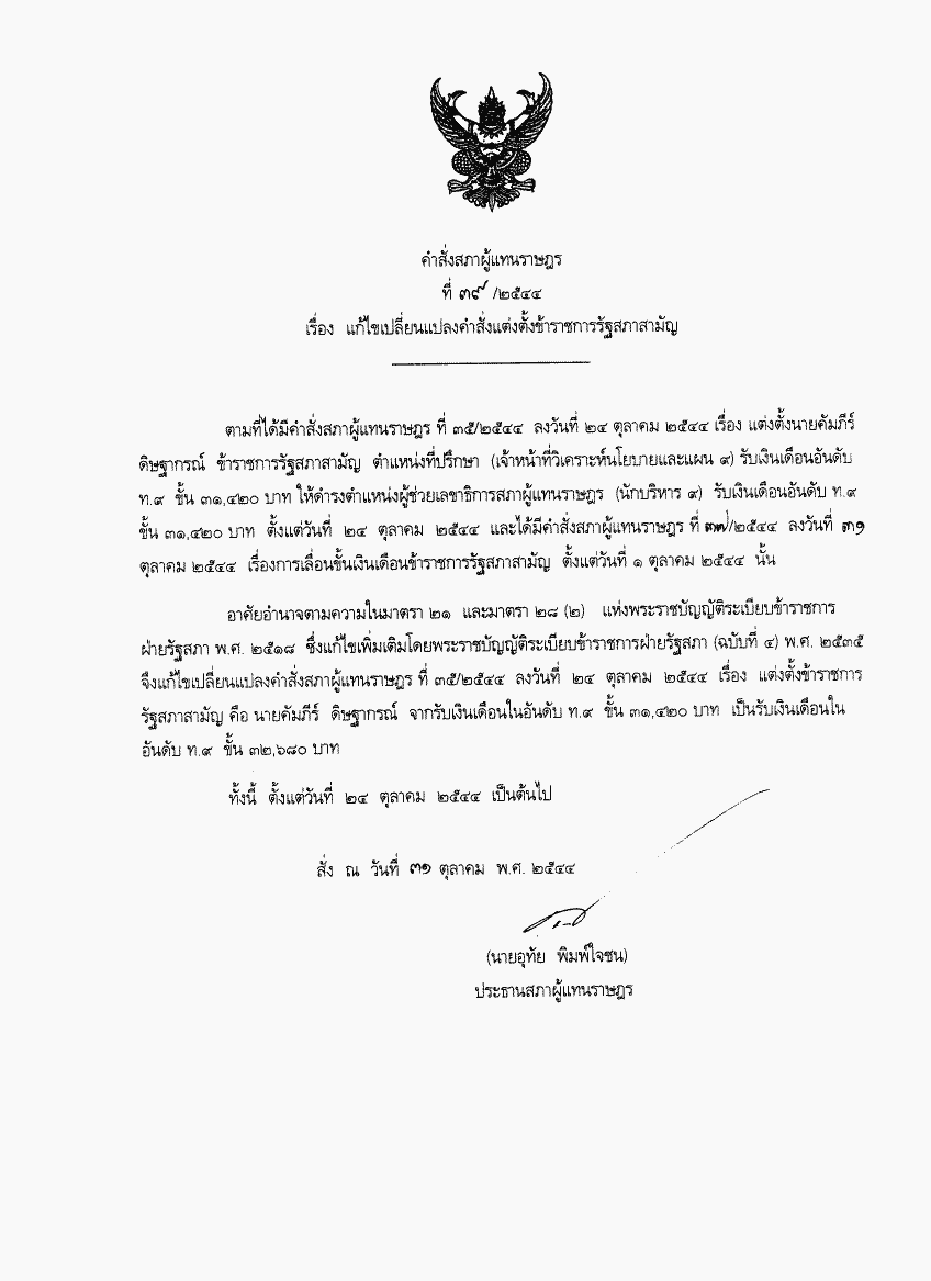คำสั่งสภาผู้แทนราษฎร ที่ 39/2544 เรื่อง แก้ไขเปลี่ยนแปลงคำสั่งแต่งตั้งข้าราชการรัฐสภาสามัญ |