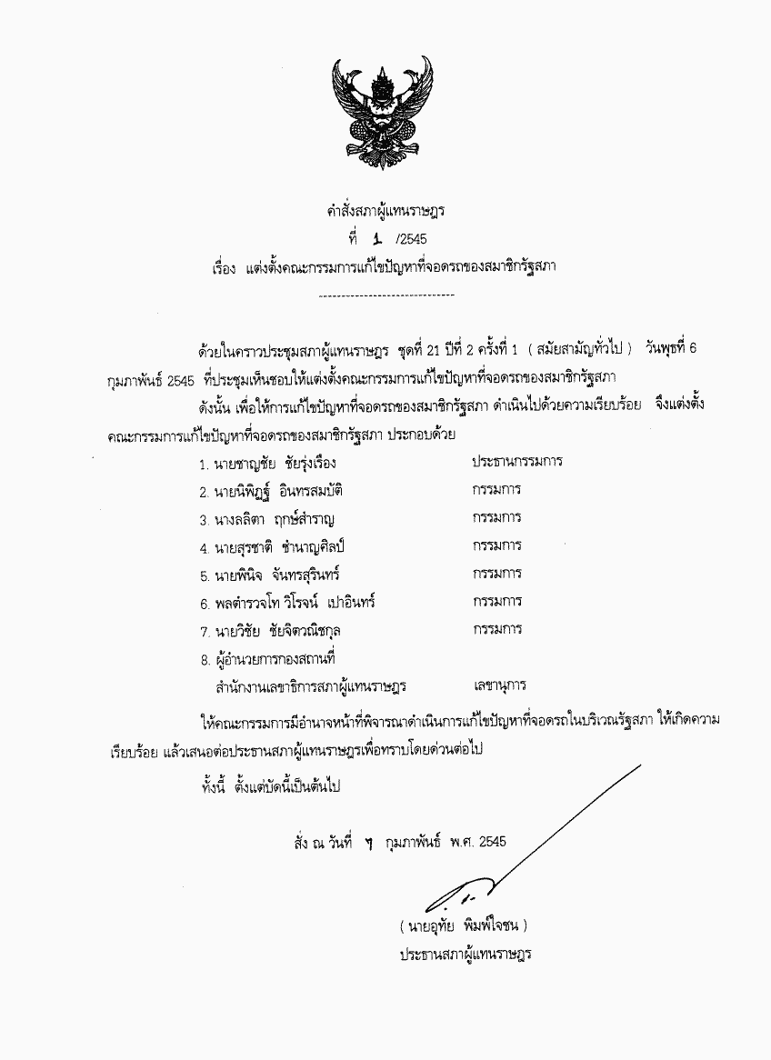 คำสั่งสภาผู้แทนราษฎร ที่ 1/2545 เรื่อง แต่งตั้งคณะกรรมการแก้ไขปัญหาที่จอดรถของสมาชิกรัฐสภา |