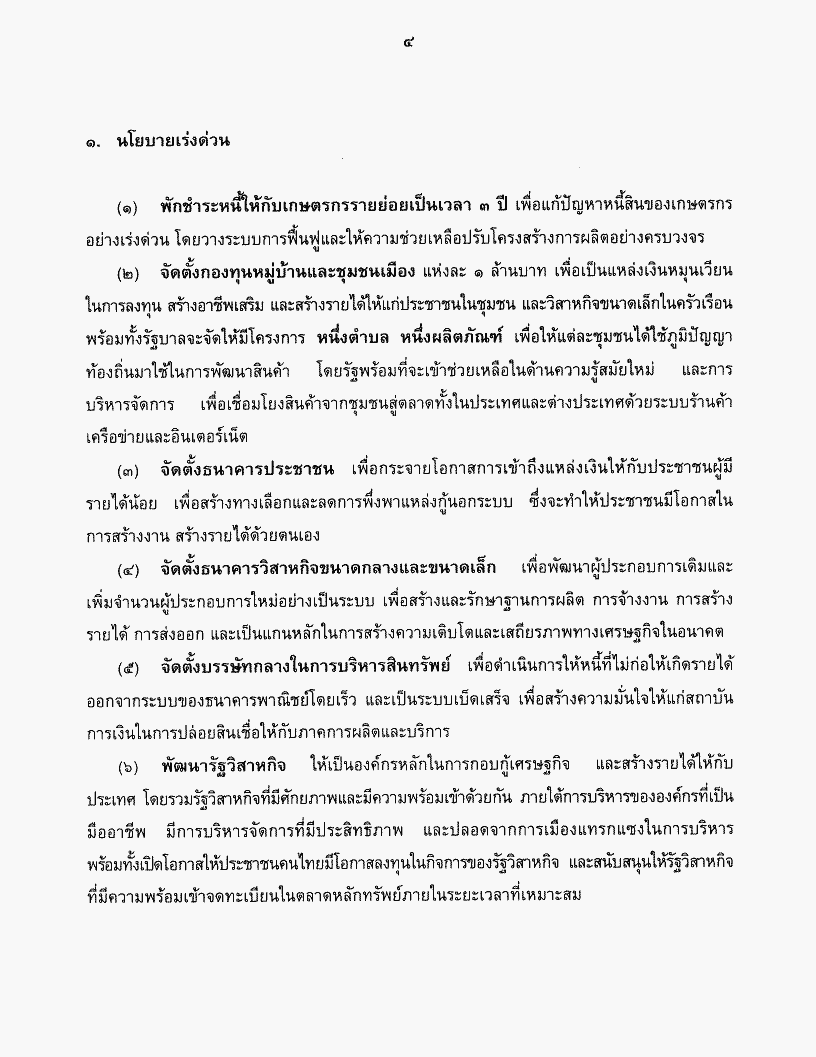 คำแถลงนโยบายของคณะรัฐมนตรี พันตำรวจโท ทักษิณ ชินวัตร นายกรัฐมนตรี แถลงต่อรัฐสภา วันจันทร์ที่ ๒๖ กุมภาพันธ์ ๒๕๔๔