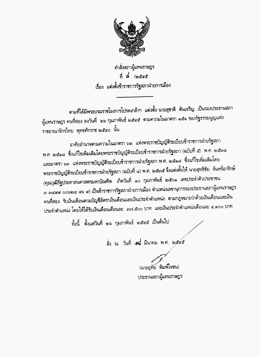 คำสั่งสภาผู้แทนราษฎร ที่ 8/2545 เรื่อง แต่งตั้งข้าราชการรัฐสภาฝ่ายการเมือง |