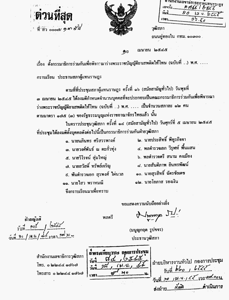 ตั้งกรรมาธิการร่วมกันเพื่อพิจารณาร่างพระราชบัญญัติยาเสพติดให้โทษ (ฉบับที่ ..) พ.ศ. .... |