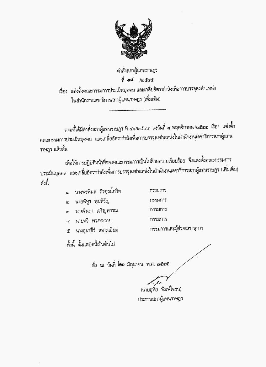 แต่งตั้งคณะกรรมการประเมินบุคคล และเกลี่ยอัตรากำลังเพื่อการบรรจุลงตำแหน่งในสำนักงานเลขาธิการสภาผู้แทนราษฎร (เพิ่มเติม) |