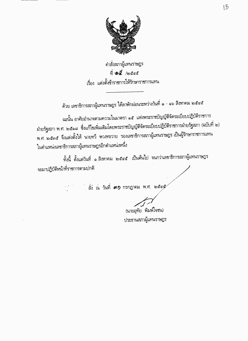 คำสั่งสภาผู้แทนราษฎร ที่ 15/2545 เรื่อง แต่งตั้งข้าราชการให้รักษาราชการแทน |