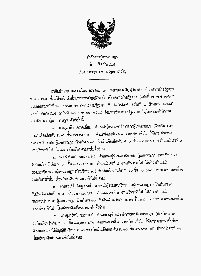 คำสั่งสภาผู้แทนราษฎร ที่ 17/2545 เรื่อง บรรจุข้าราชการรัฐสภาสามัญ |