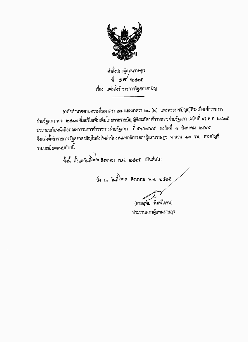 • คำสั่งสภาผู้แทนราษฎร ที่ 18/2545 เรื่อง แต่งตั้งข้าราชการรัฐสภาสามัญ